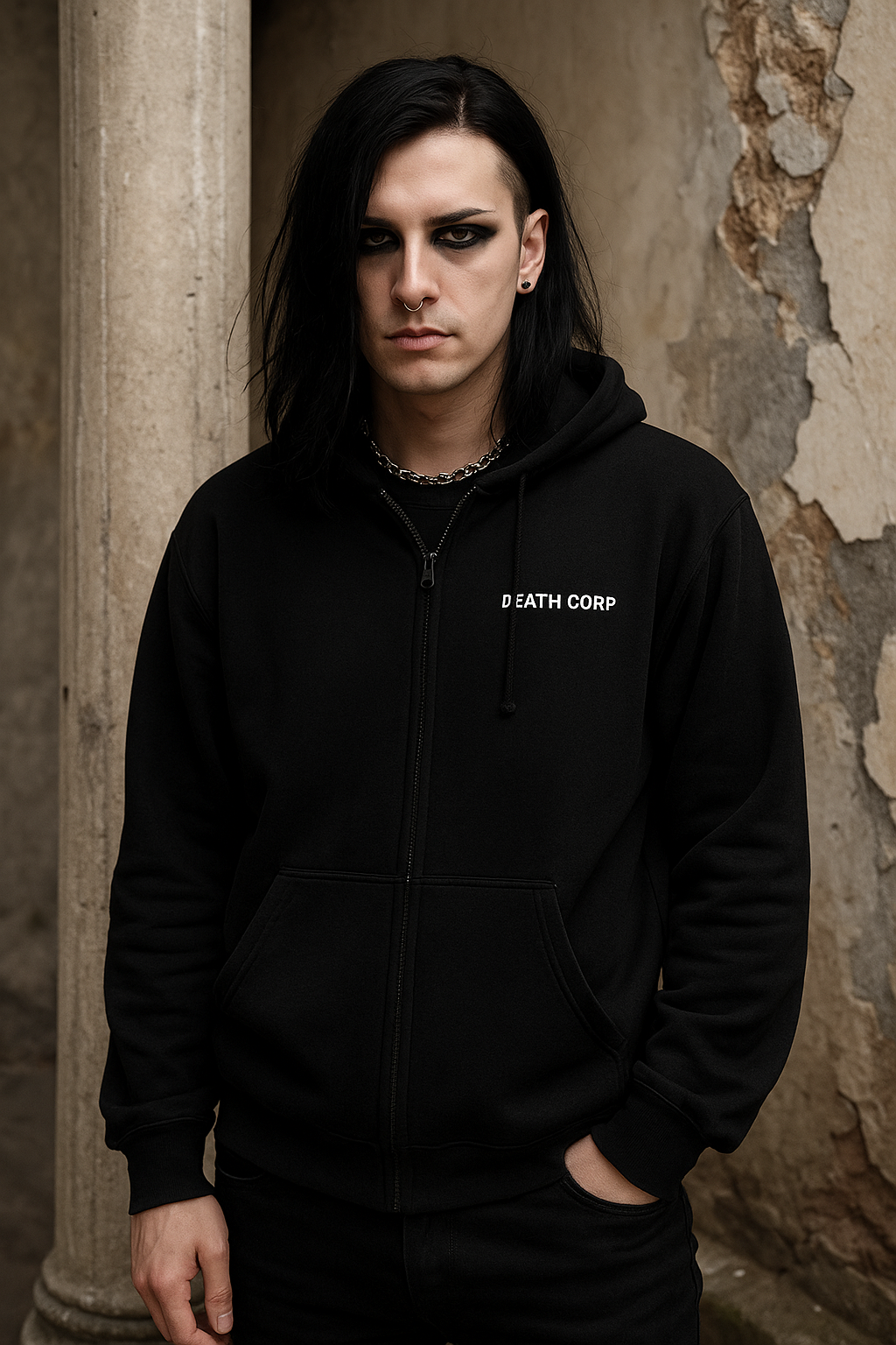 Stay cool and stylish with our Death Corp zip hoody featuring the classic logo and a surprise glowing print. Perfect for any fan of the brand. Stay comfortable and stand out with this unique hoody.👻