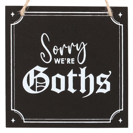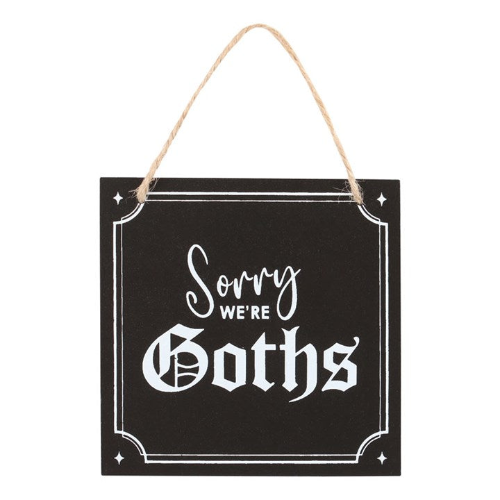 Offer a gentle warning to unknowing guests with this funny hanging sign. Features 'Sorry We're Goths' text written in gothic lettering that is sure to make a wickedly witty welcome. Finished with a jute rope for easy hanging.