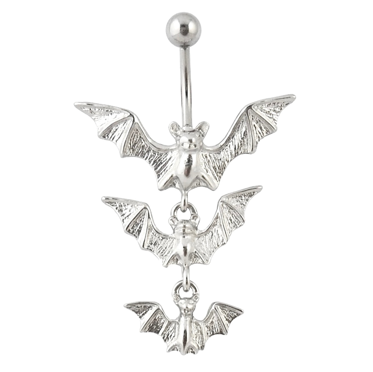 This triple bat belly bar offers a distinctive addition to your piercing collection, featuring a stylish and edgy triple bat design. Crafted with precision from nickel-free metal, it ensures both comfort and safety for sensitive skin. Its high-quality construction provides durability while making a bold statement, perfect for those who want to express their unique style with confidence. Ideal for everyday wear or special occasions, this belly bar combines aesthetic appeal with reliable performance.